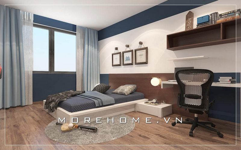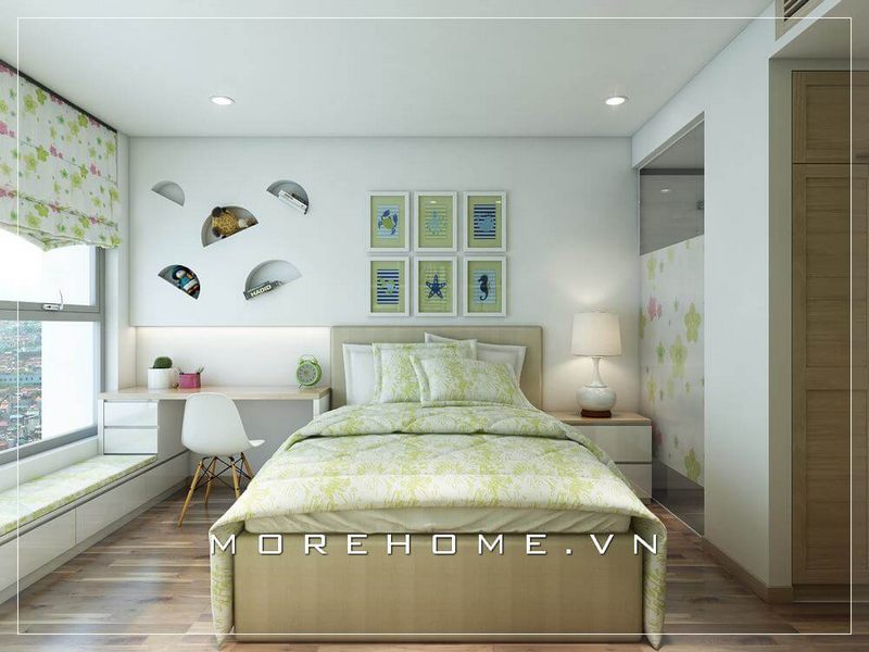 Bàn học gỗ công nghiệp được bố trí cạnh cửa sổ giúp không gian học tập luôn được thông thoáng.