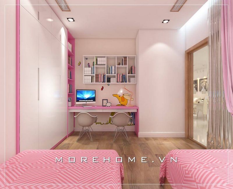 Bàn học và kệ sách treo tường của phòng ngủ bé gái hiên đại tinh tế hài hòa sắc trắng cao cấp với màu hồng thơ mộng.