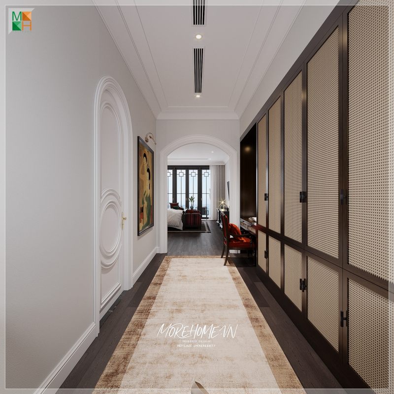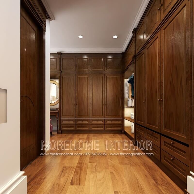 Hệ thống tủ quần áo bằng gỗ tự nhiên được thiết kế với nhiều ngăn tủ và bố trí ở một hành lang riêng giúp cho không gian phòng trở nên gọn gàng hơn cũng như giúp gia chủ lưu trữ được nhiều đồ đạc hơn