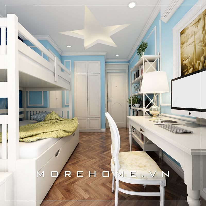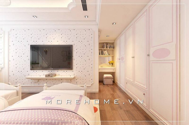 Tủ quần áo trẻ em gỗ tự nhiên phun sơn trắng sang trọng, thiết kế kịch trần gợi lên không gian cao và thoáng hơn
