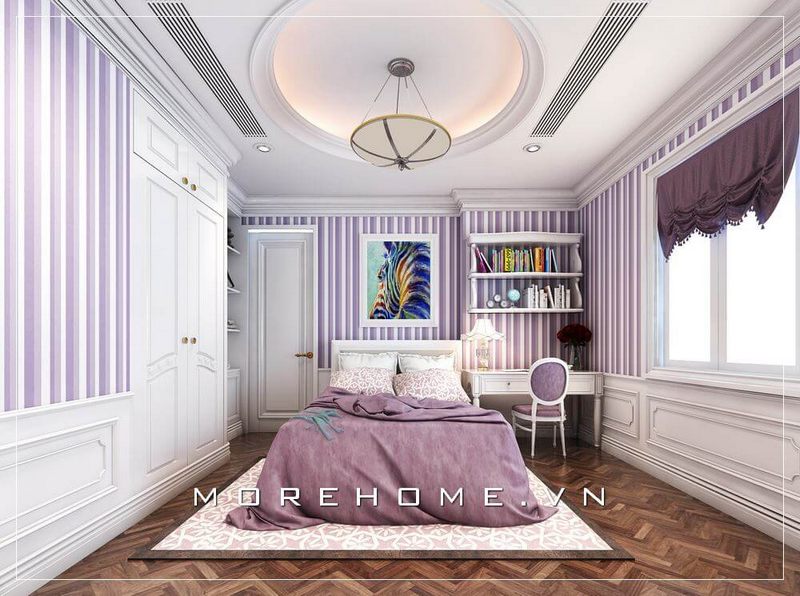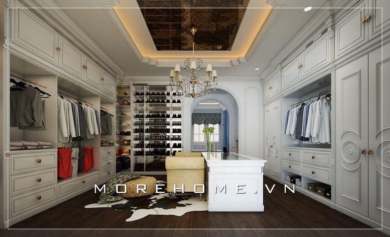 Hệ thống tủ quần áo và kệ tủ đều làm bằng gỗ sồi phun sơn trắng với những chi tiết góc cạnh tân cổ điển
