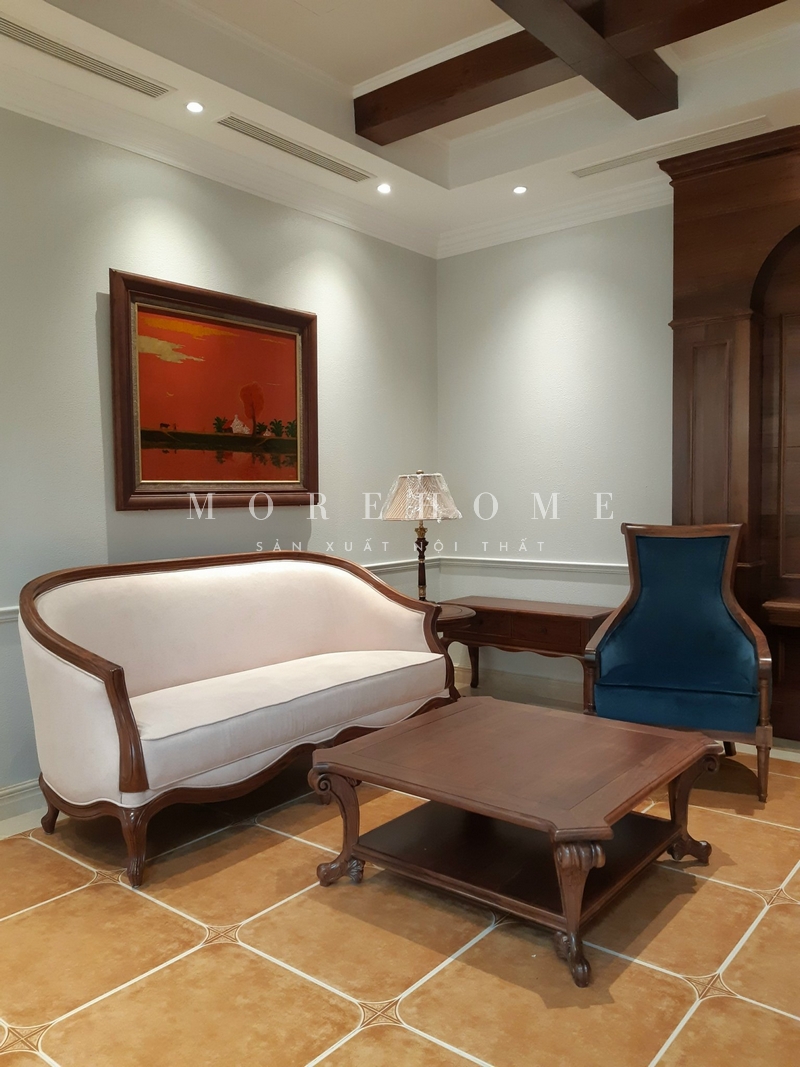 Sofa văng có thiết kế khung gỗ óc chó bọc nỉ màu be tân cổ điển, cung cấp sự thoải mái, tiện nghi và thẩm mỹ cao.